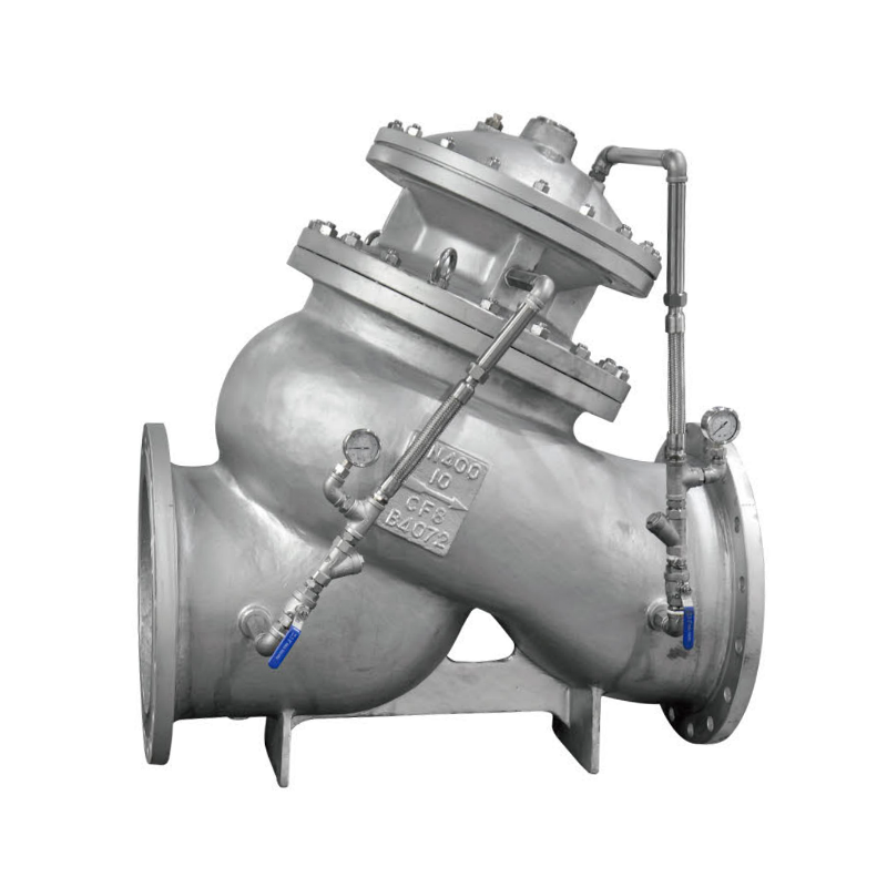 3、消除水錘和噪音:水泵停止運行時,主閥分兩級關閉,主閥瓣先快速關90%,小閥瓣再緩慢關閉(關閉速度可根據(jù)現(xiàn)場工況進行調節(jié)),從而消除了水錘和噪音。
